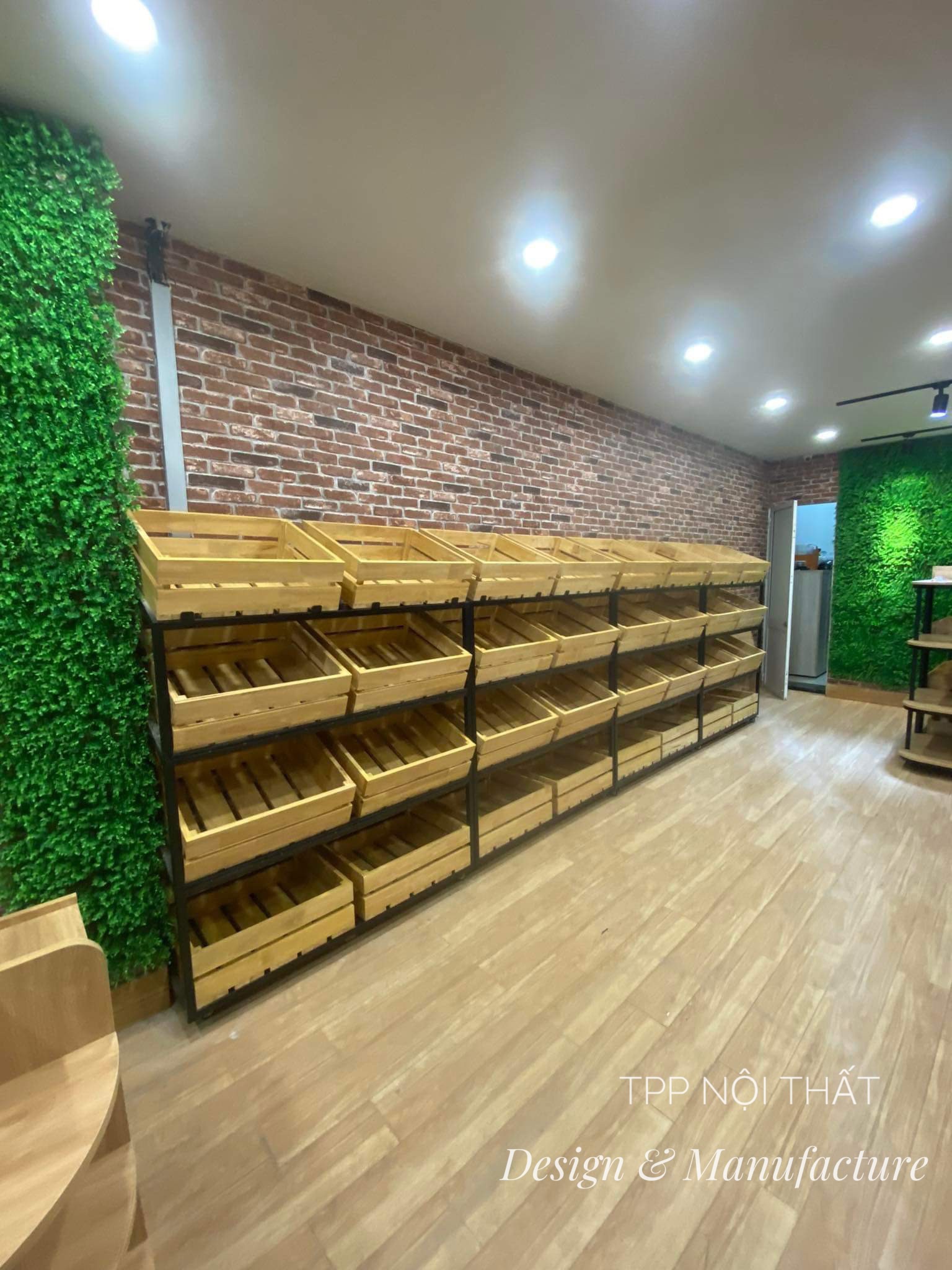 Đảo kệ hoa quả giữa nhà khung sắt kết hợp gỗ thông ghép thanh bền đẹp