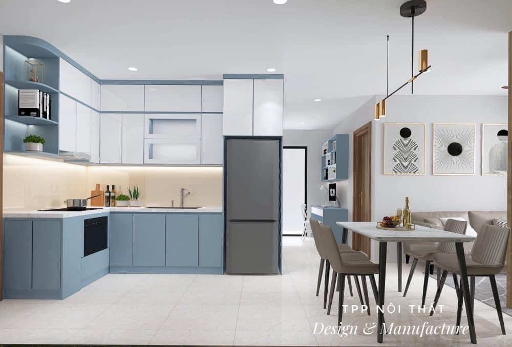 Nội thất phòng bếp liền kề phòng khách căn hộ chung cư 2 phòng ngủ.