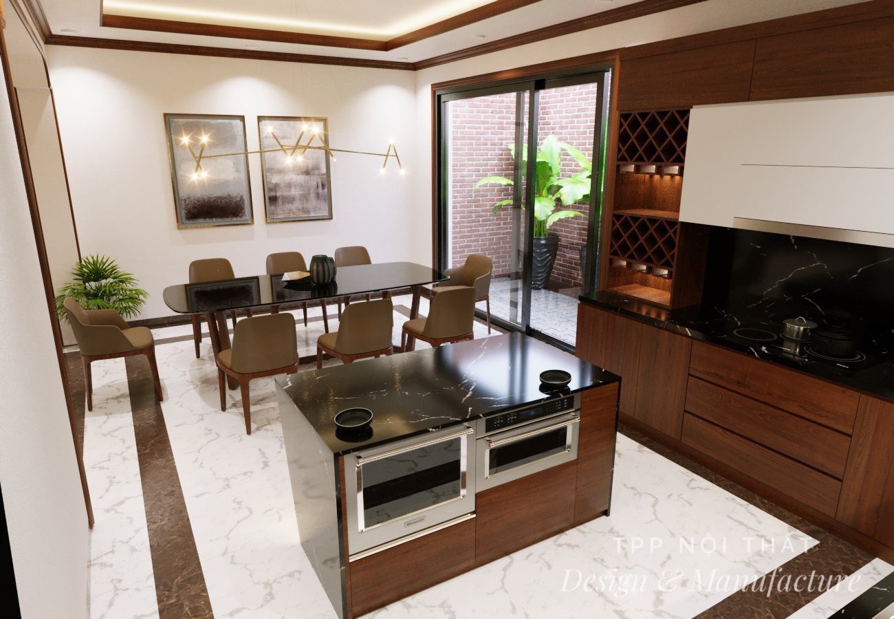 Nội thất bếp kết hợp bàn đảo biệt thự sân vườn.