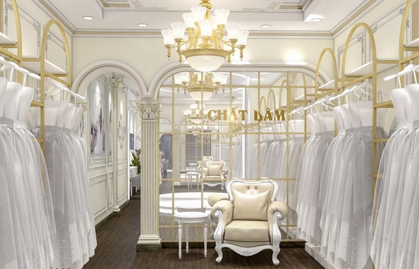 Shop váy cưới cần sự trang trọng, cao cấp nên các thiết kế kệ treo inox được phun sơn vàng kết hợp đèn trần phong cách Tây Âu giúp không gian nổi bật và ấn tượng đến khách hàng.