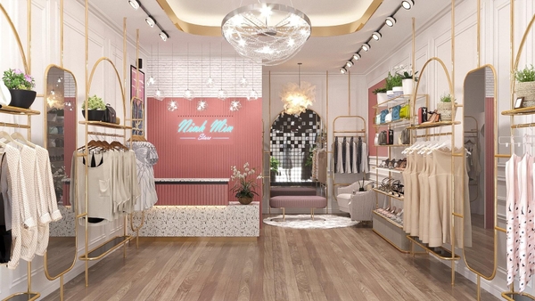 Với một cửa hàng thời trang trẻ trung, nữ tính nhưng vẫn hiện đại, phá cách, thiết kế lựa chọn tông màu vàng - trắng chủ đạo và điểm nhấn với ốp tường hồng nổi bật tên shop cùng hệ thống đèn lung linh thu hút mắt nhìn.