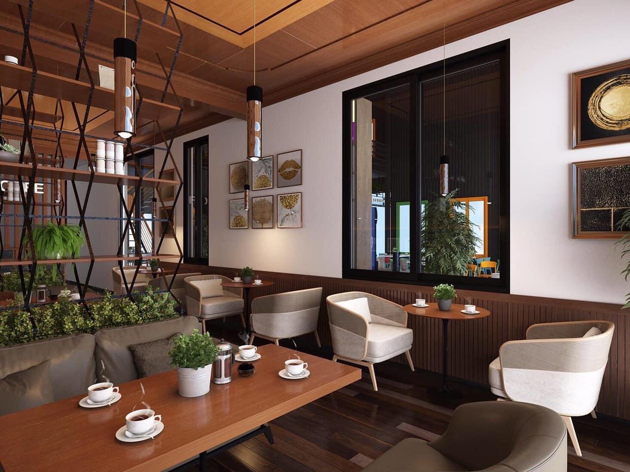 1. Thiết kế nhà hàng cafe - không gian thông thoáng, hài hòa.