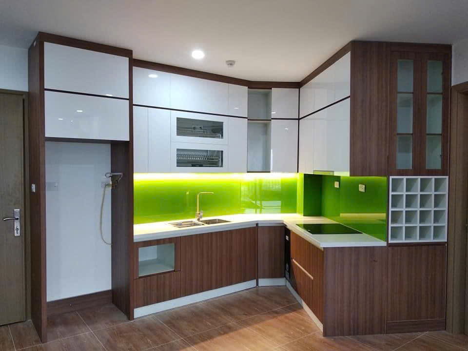 ✔ Thêm kính cường lực màu (trắng, xanh, ghi khói) ở tường bếp để dễ lau chùi và tăng hiệu ứng thẩm mỹ.