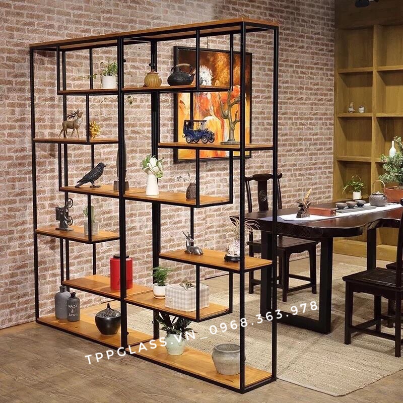 Kệ gỗ khung sắt trưng bày, decor thiết kế rất đơn giản kết hợp hài hòa với các hoa văn vân gỗ mộc mạc, trang nhã để đem tới một sản phẩm giản dị nhưng tinh tế và đẹp mắt. Thiết kế đa năng phù hợp trưng bày nhiều loại mặt hàng.