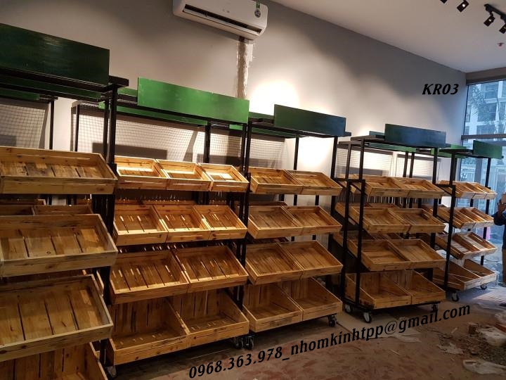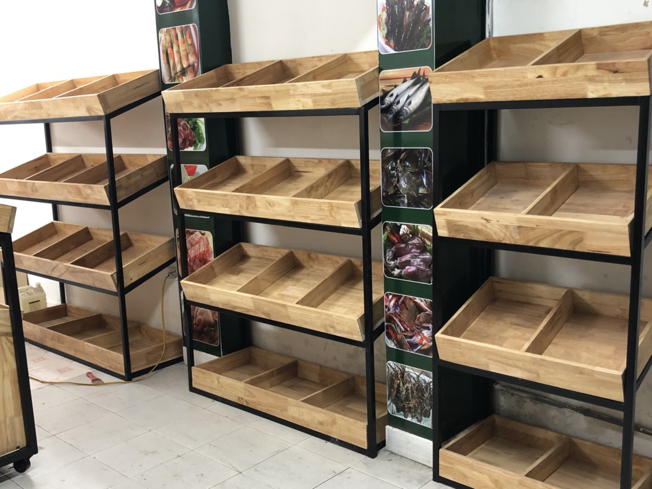 Kệ gỗ trưng bày hoa quả, siêu thị mini, thực phẩm sạch