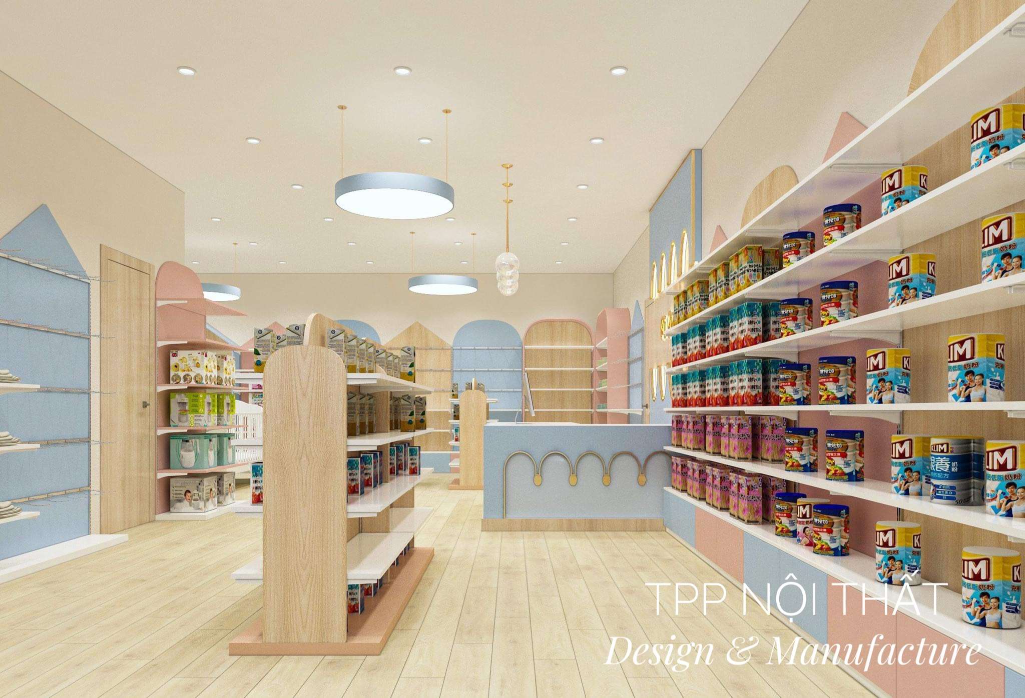Kệ trưng bày, để đồ cửa hàng mẹ và bé khu vực giữa nhà và sát tường