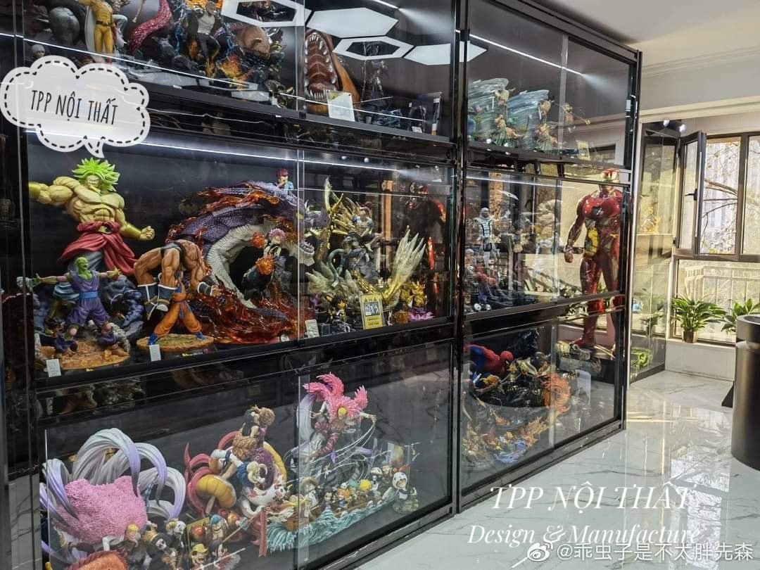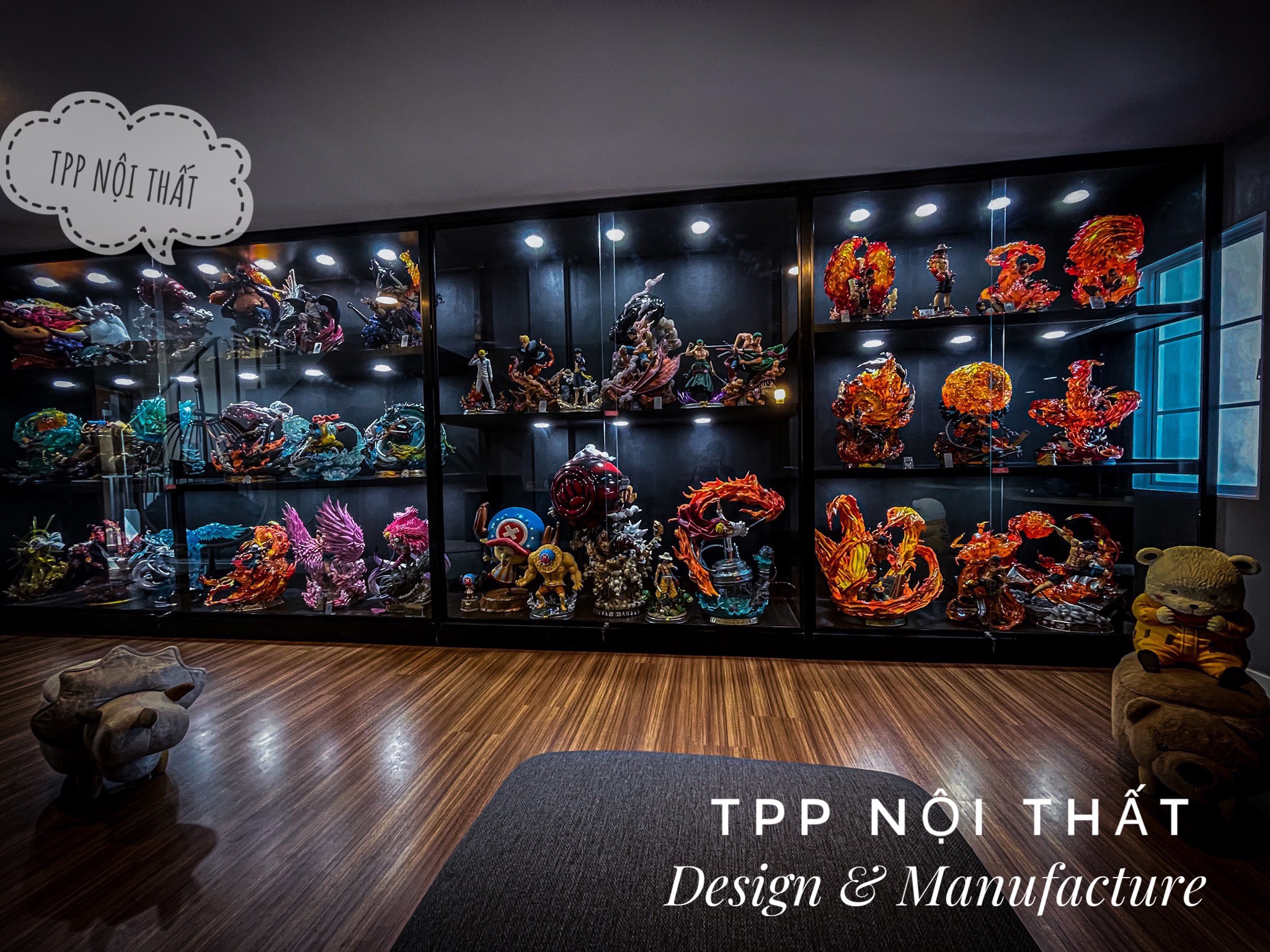 Tủ kính khung sắt màu đen kết hợp hệ thống đèn led là giải pháp tuyệt vời để trưng bày mô hình