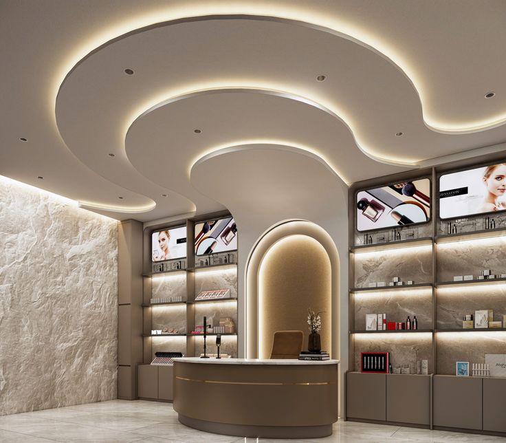 Tủ kệ trưng bày shop mỹ phẩm sát tường - có đèn led tạo hiệu ứng
