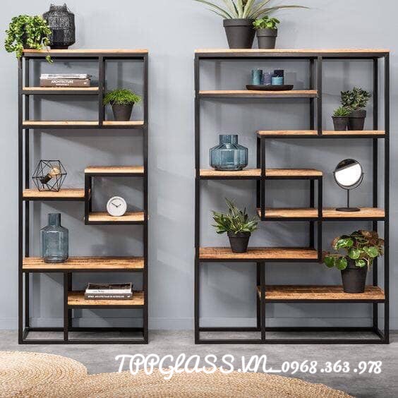 Mẫu kệ trang trí khung sắt mặt gỗ với thiết kế tinh tế ấn tượng được sử dụng trang trí ở không gian phòng khách, phòng làm việc,... nhằm tạo điểm nhấn cho không gian
